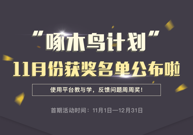 产教融合“啄木鸟计划”活动已经上线一个多月啦,根据活动规则,小编汇总了11月份最后两周的意见采纳情况,同时本次将发布11月份获奖名单,小伙伴们是不是很期待呢,赶紧来围观吧~
