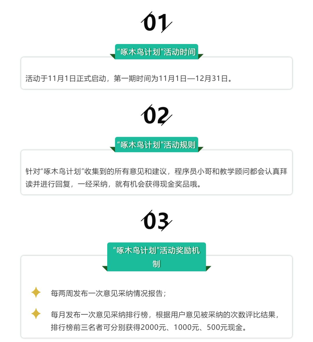 参与“啄木鸟计划”活动,人人都可以成为产品经理哦。产教融合平台注册用户、院校老师和企业导师,都赶快参与进来吧,下个月您的名字就有可能出现在获奖名单里呢!